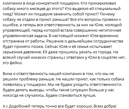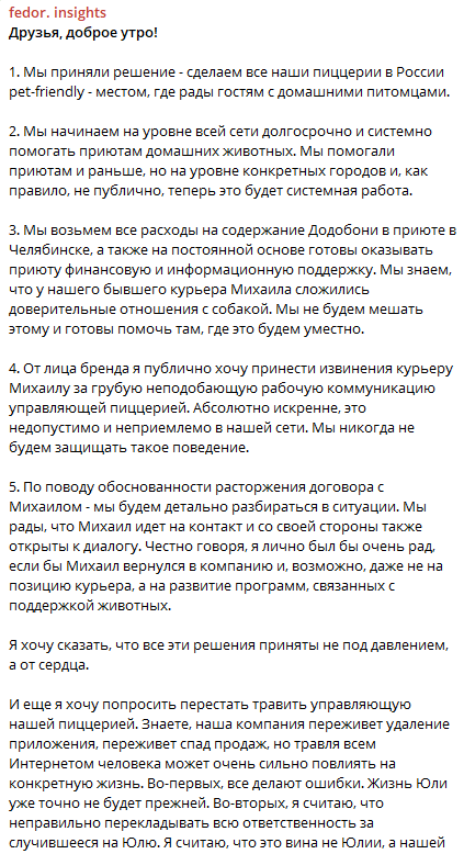 - Принёс публичные извинения курьеру за некорректную коммуникацию со стороны управляющей пиццерией.