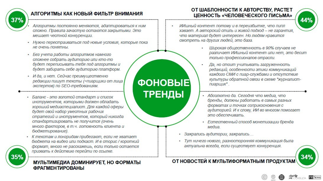 Сейчас хаотизация медиапотребления, контроль и рутинизация ИИ формируют каркас индустрии. Также набирают обороты влияние поисковых алгоритмов и запрос на мультиформатность контента.