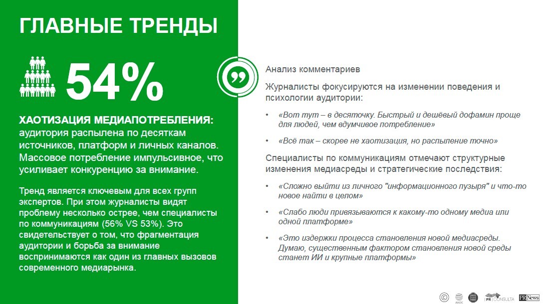 На тренд указали 51% журналистов и 45% - специалистов по коммуникациям. Представители СМИ, в целом, воспринимают проблему, как фундаментальный вызов профессии: